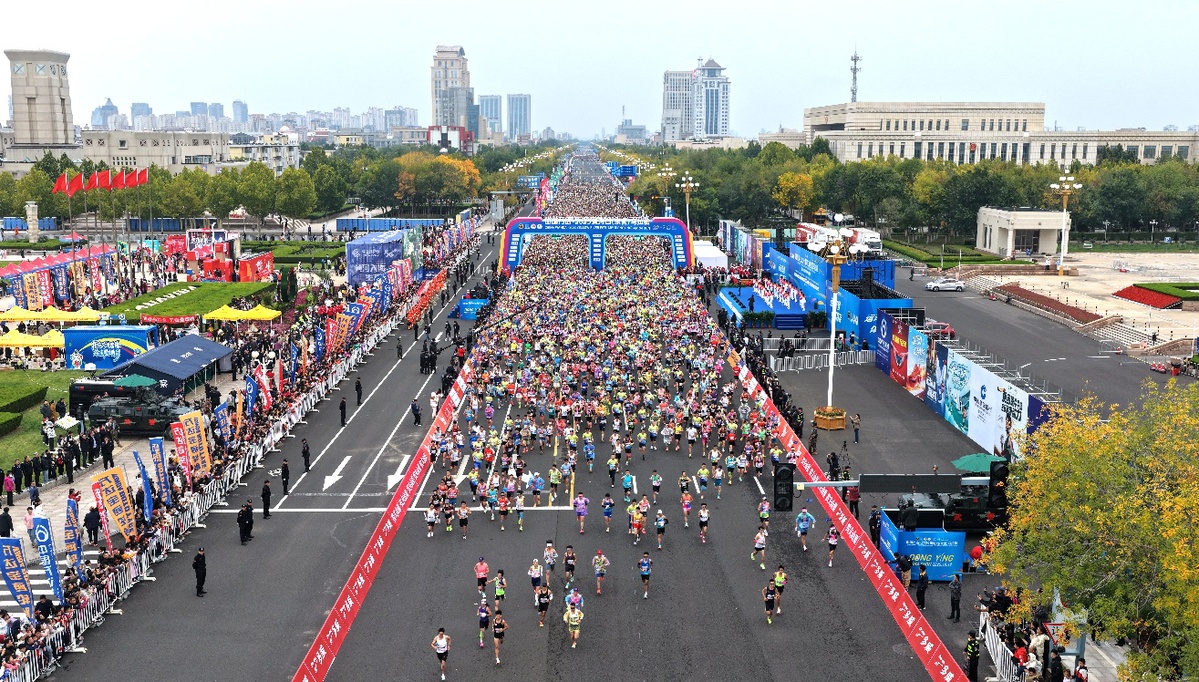 10月19日,中国万达·2025黄河口(东营)马拉松暨山东马拉松联赛(东营站)举行。约3.5万名跑者齐聚东营,热情开始跑步。